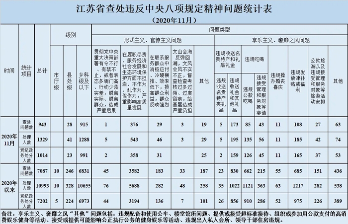 2020年11月,全省共查处违反中央八项规定精神问题943起,处理1329人,其中给予党纪政务处分1014人。从问题类型看,查处形式主义、官僚主义问题428起、处理626人,查处享乐主义、奢靡之风问题515起、处理703人。从人员级别看,处理县处级干部41人、乡科级及以下人员1288人。